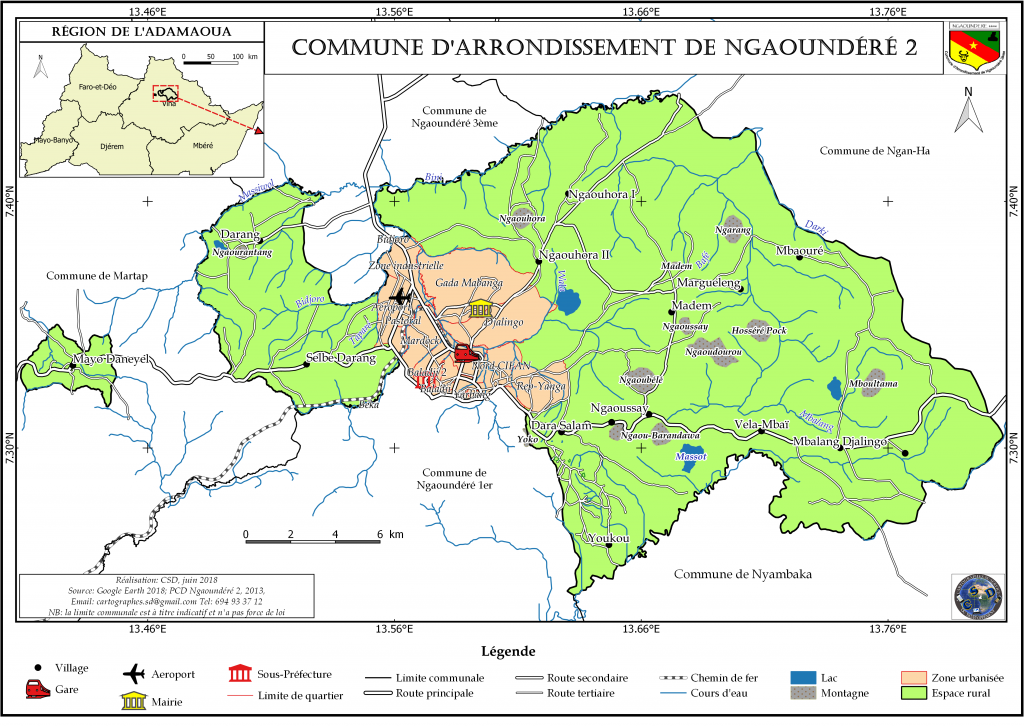 Située à 13,5961° de longitude Est et 7,3551° de latitude Nord, dans le Département de la VINA, Région de l’Adamaoua, la Commune d’arrondissement de Ngaoundéré 2ème, a une superficie d’environ 1630km².